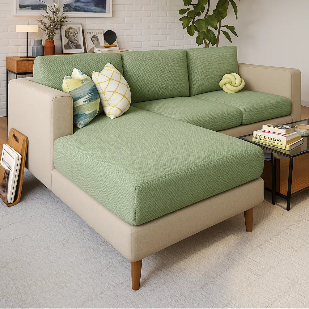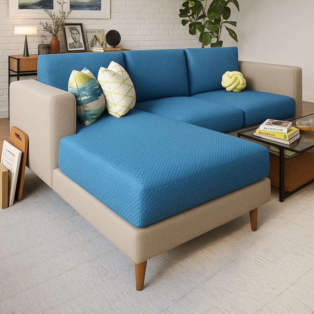 - Coloque y ajuste: Deslice las fundas cubriendo cada parte del sofá. Su elasticidad garantiza una adaptación precisa a sus formas